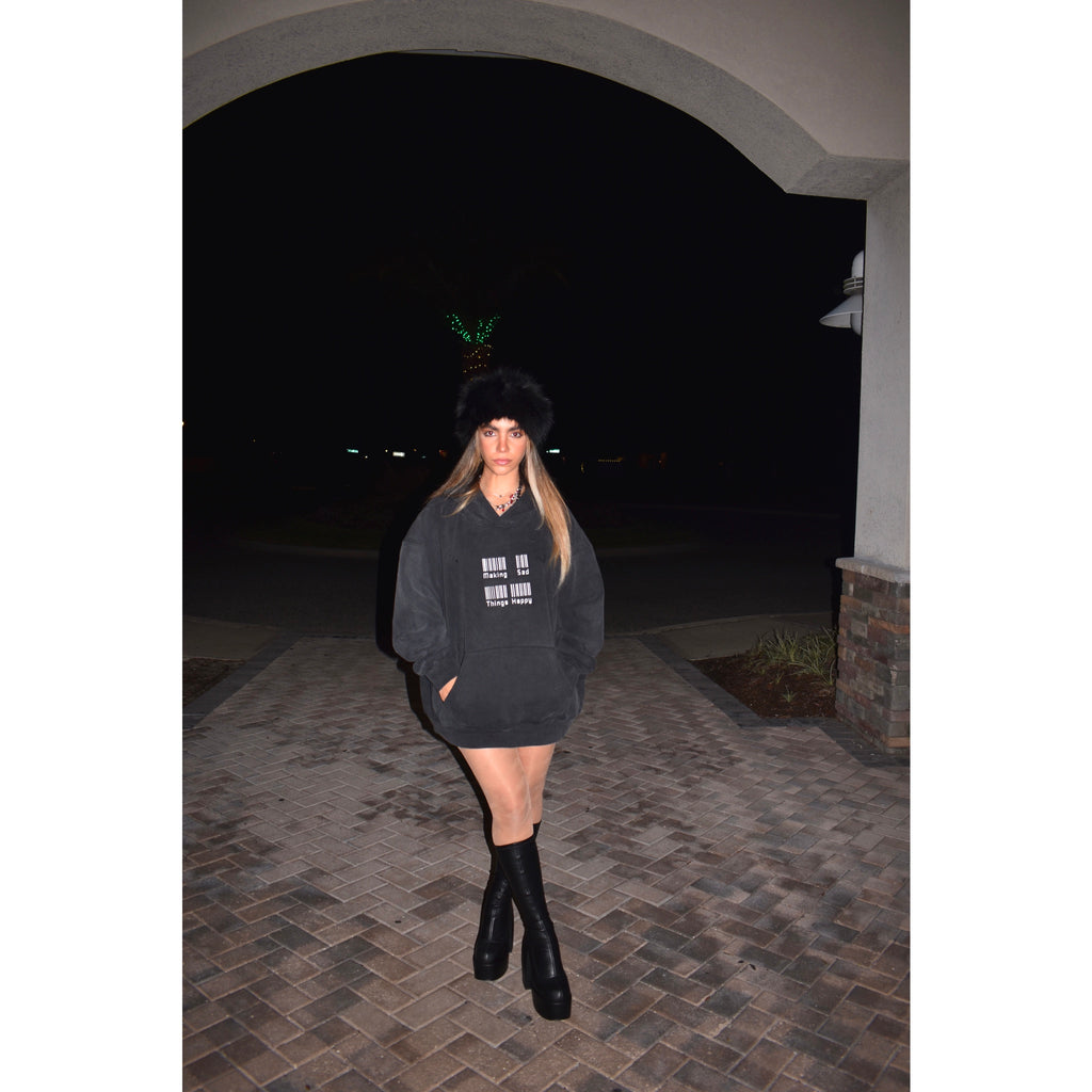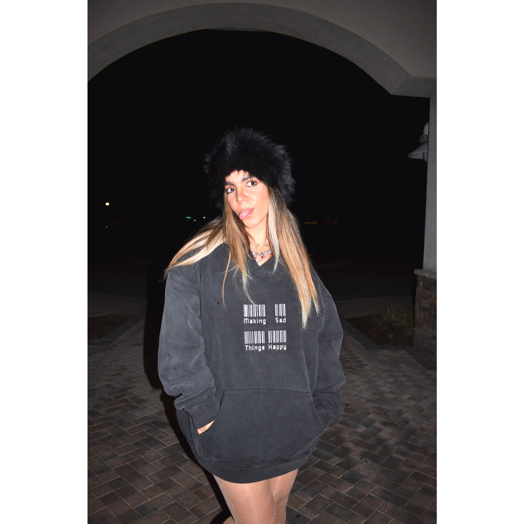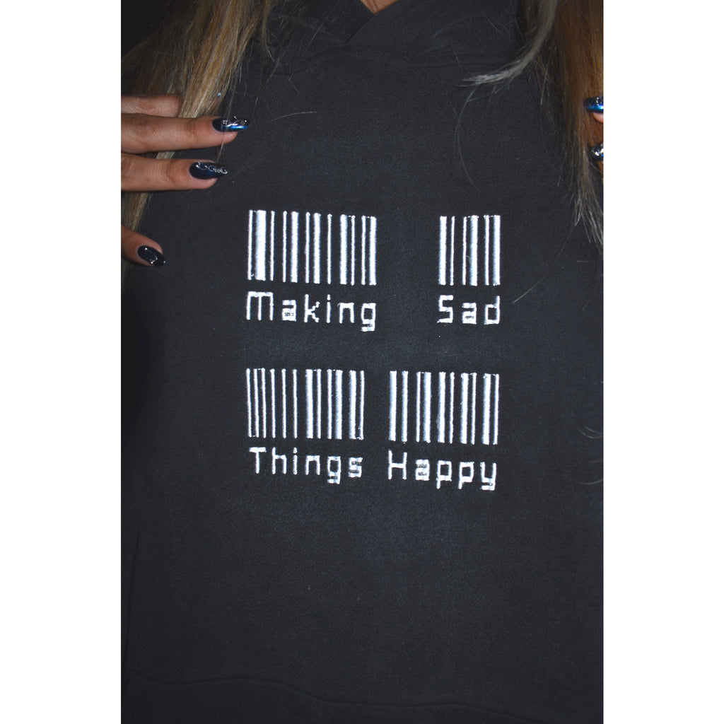 Embroidered “Making Sad Things Happy” + barcode on front.