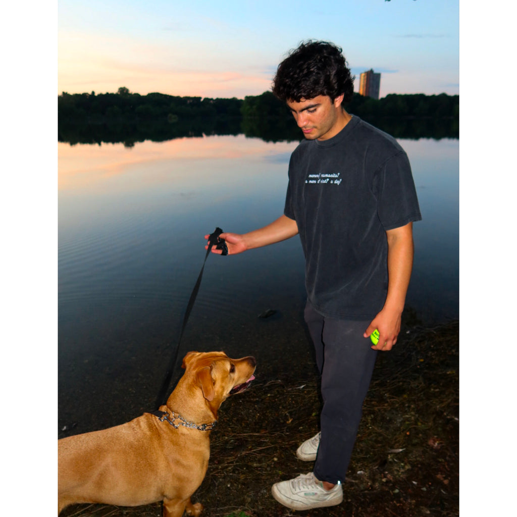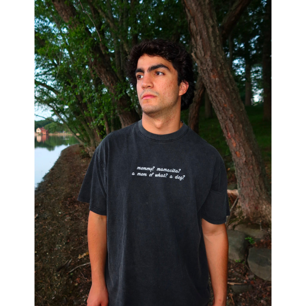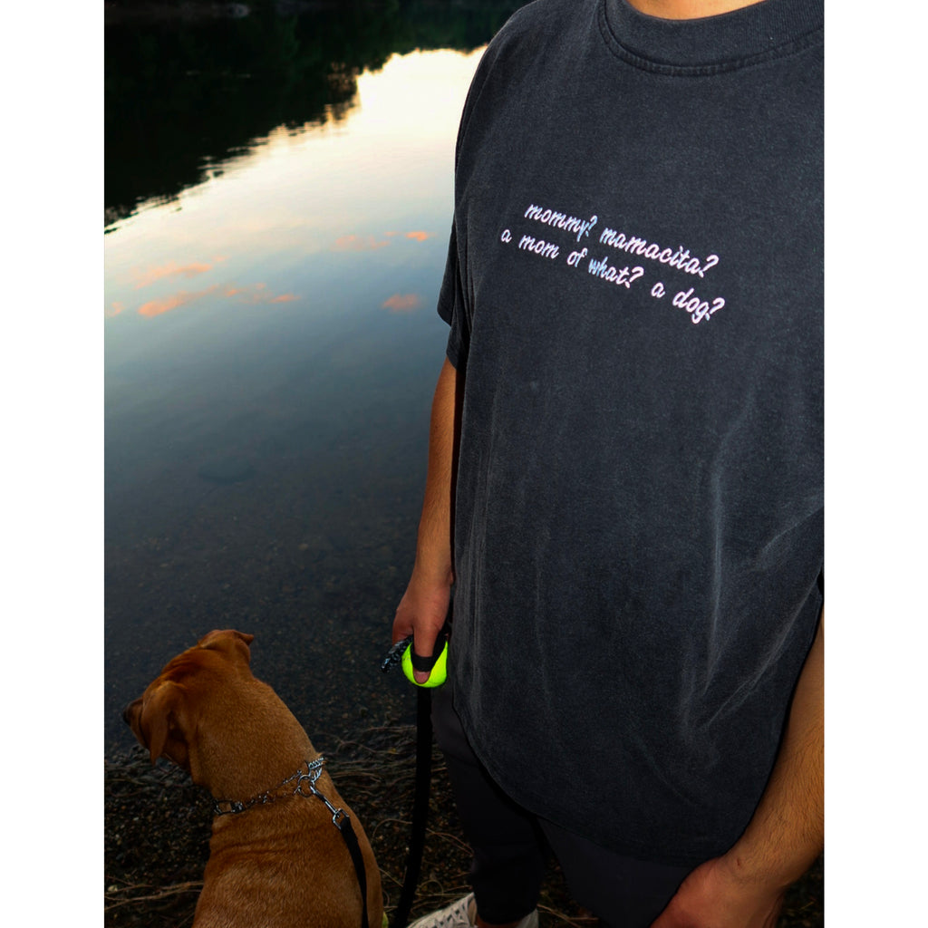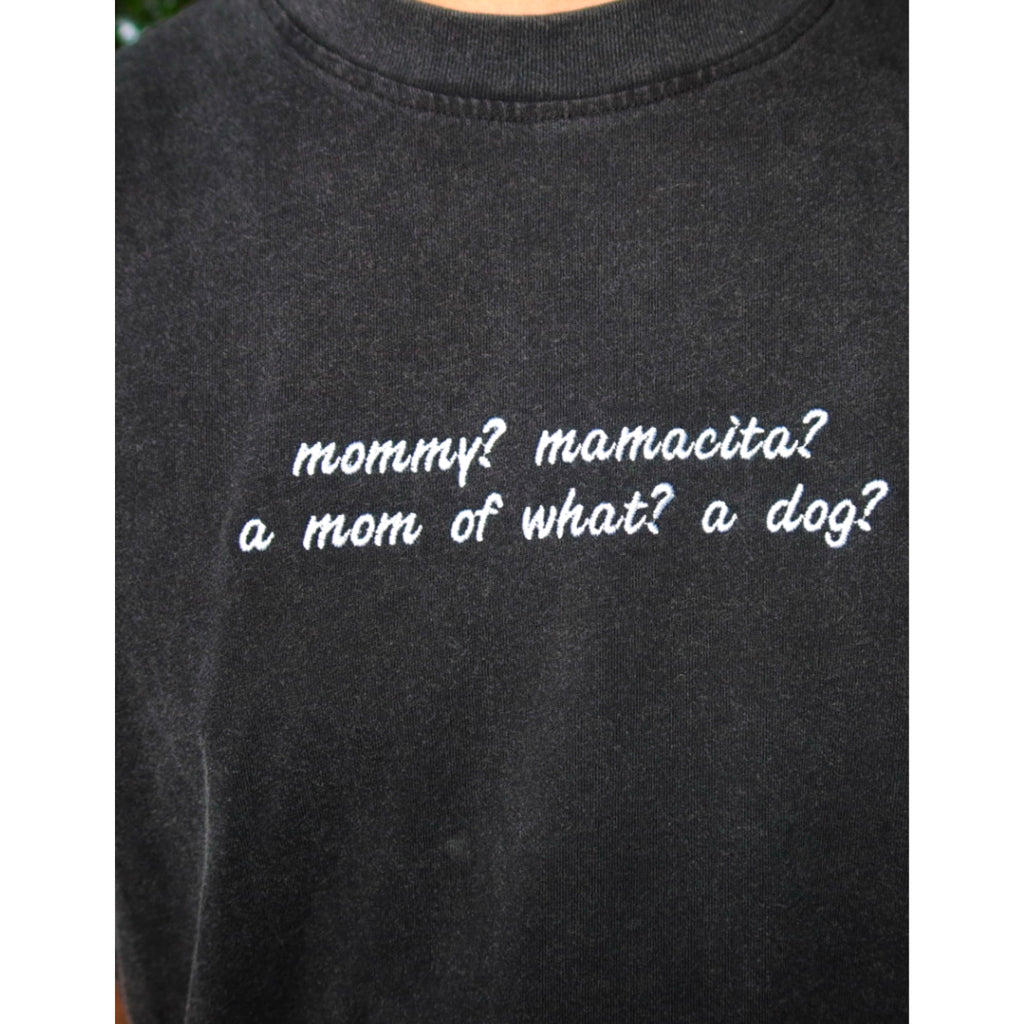 Embroidered “mommy? mamacita? a mom of what? a dog?” on front.