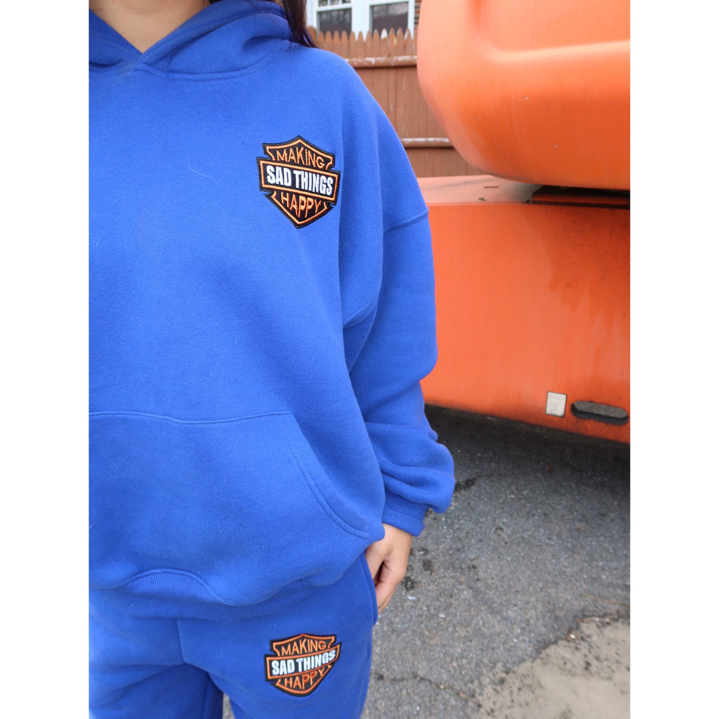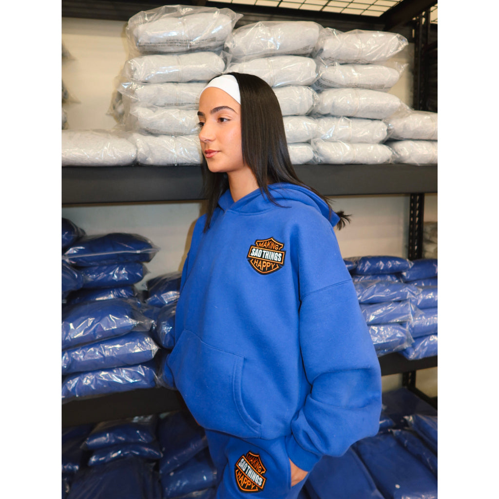 Oversized fit: size down for regular fit. Alex wears a S, Electric Blue, hoodie.