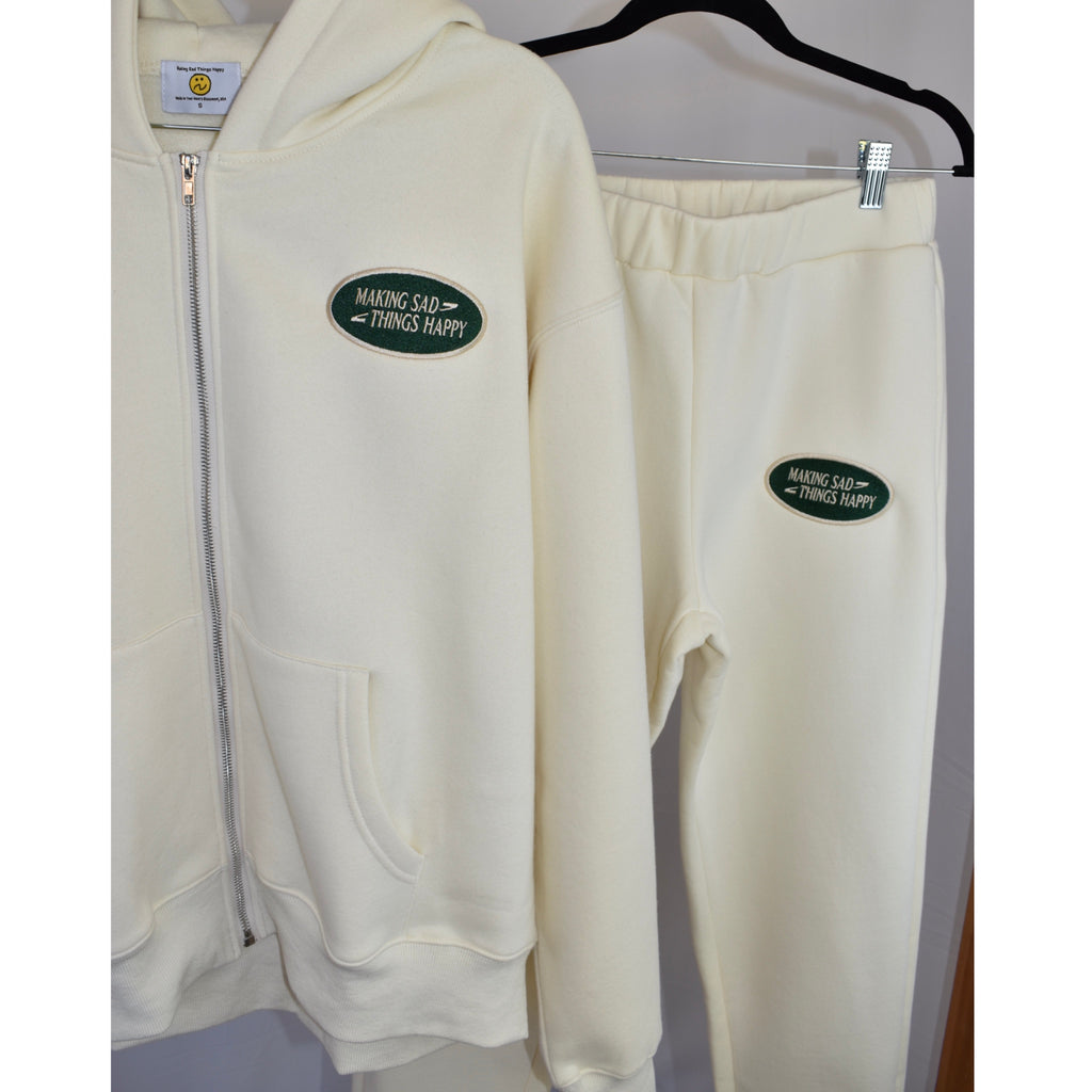 Embroidered “MAKING SAD THINGS HAPPY” on front.